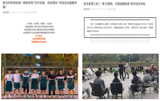 二是巧用文体活动,丰富校园生活,推动思政教育“活起来”。精心策划“新生杯”篮球赛、辩论赛以及团体辅导等,增进学生之间的了解与联系,加强班级凝聚力,帮助新生更好更快地适应大学生活;举办“‘寓’见能电,共建温暖宿舍”主题活动,包括“寓”见装扮、“寓”见故事、“寓”见合影三个部分,引导学生养成良好的卫生习惯和积极向上的生活方式,构建和谐宿舍人际关系;开展“见字如面,纸短情长”书信征集活动,为在校学生与家人、朋友和暂缓返校学生沟通交流搭建平台,用书信的形式抒发感情;组织学生进行篮球、网球、羽毛球、跑步等体育锻炼,丰富学生课余生活,帮助学生强身健体。