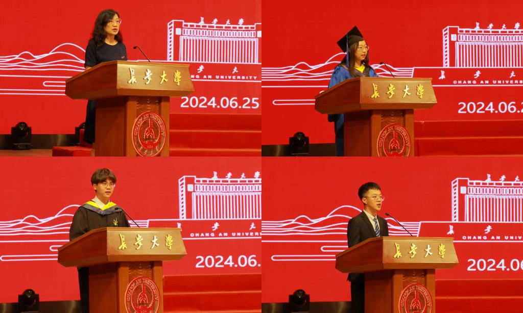 研究生毕业生代表柳红深情回顾了三年研究生的求学之路,表示将牢记师长的谆谆教诲,在未来书写出属于自己的精彩篇章。本科生毕业生代表任浩对母校老师们的悉心培养表达了深深的感谢,他表示会牢记“弘毅、明德、笃学、创新”的校训精神,以更从容、更无畏的姿态奔赴未来、建功立业。在校生代表李鑫洋代表全体学弟学妹向即将开启新征程的学姐学长送上祝福及感谢,祝福学姐学长在未来的道路上越走越远、越飞越高。