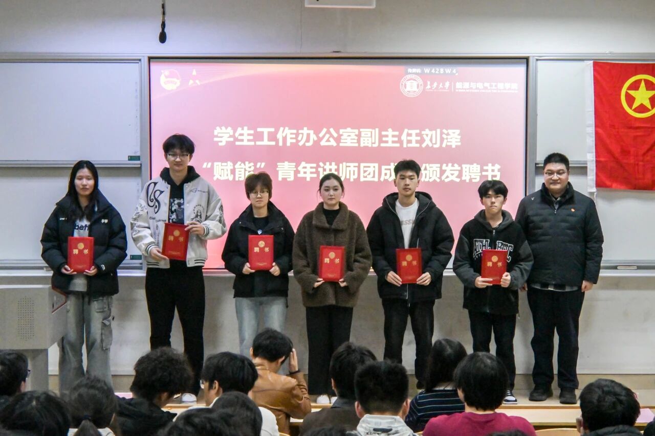 学生工作办公室副主任刘泽为“赋能”青年讲师团成员颁发聘书。