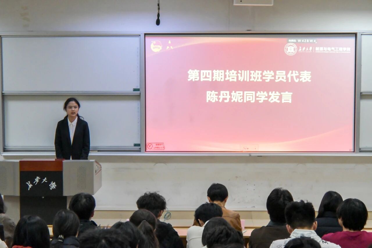 第四期培训班学员代表、科技发展班班长陈丹妮同学发言,她表示将以马克思主义理论筑牢思想根基,认真接受思想淬炼、政治历练、实践锻炼与专业训练,成长为矢志不渝的爱国者、心怀远志的逐梦者。