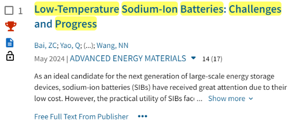 qy千亿球友会孟伟嘉博士以第一通讯作者身份发表在《Advanced Energy Materials》上的题为《Low-Temperature Sodium-Ion Batteries: Challenges and Progress》的研究论文,入选ESI高被引论文,被引频次排名前1%,该论文正式发表于2024年5月,目前被引用100余次。