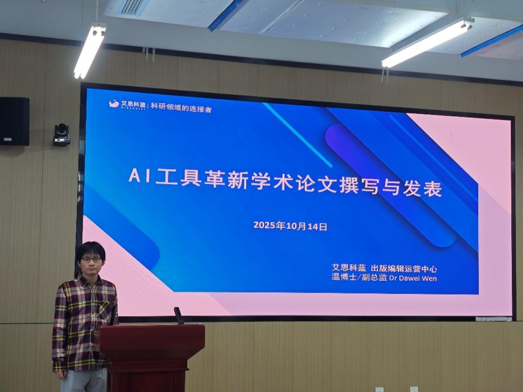 为积极响应国家关于人工智能赋能教育发展的战略部署,引导师生科学、高效地运用智能工具,10月14日下午,qy千亿球友会在612会议室举办了以“AI工具革新学术论文撰写与发表”为主题的讲座,艾思科蓝出版编辑部温大尉总监担任主讲。讲座由副院长徐先峰主持。