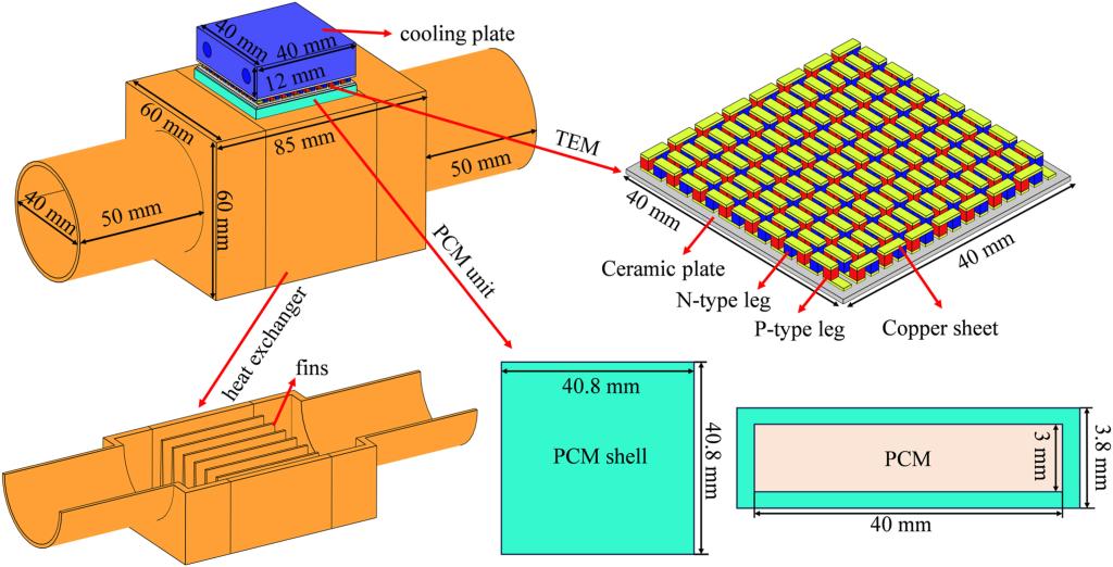 为了提升车辆行驶工况下热电发电机(TEG)的发电量并降低其性能波动,研究团队设计了一种在换热器与热电模块之间集成相变材料(PCM)的PCM-TEG系统,通过建立包含PCM相变过程的瞬态CFD与热电混合数值模型,结合实验验证(模型输出电压与功率的实验值和模拟值一致性良好,输出电压RMSE为0.141V、R²达0.927),研究了PCM在真实车辆行驶循环(NEDC)下对TEG性能的影响,同时提出“波动系数”这一新型评价指标以量化TEG性能参数的波动程度;此外,该研究还系统分析了PCM内部翅片设计(如有无翅片、翅片高度)和PCM体积(通过改变底面积或厚度实现)对提升PCM传热性能及PCM-TEG性能输出的作用。最终证实PCM可使TEG功率波动系数最大降低32.81%,且通过优化PCM传热性能,能在降低5.71%功率波动的同时,使TEG总发电量提升3.23%、有效转换效率提升2.19%。该研究为动态工况下PCM-TEG的设计与热优化提供了关键理论依据。