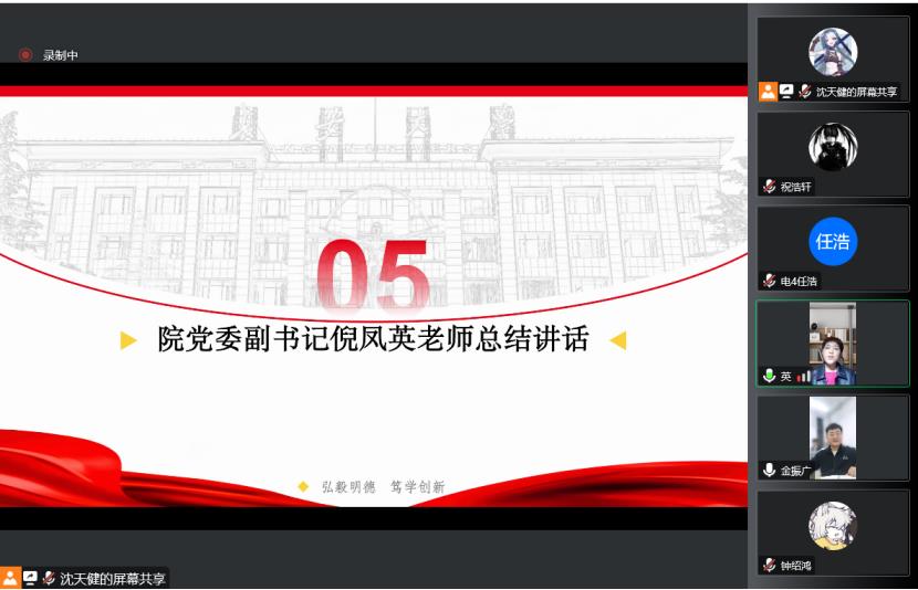 钟绍鸿、任浩、蒋巍峻分别从参加团学组织工作、体育舞蹈活动、志愿服务等方面的分享了相关经历和经验,号召大家要珍惜集体。