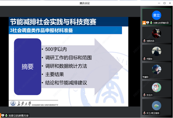 宣讲会开始后,刘意立老师介绍了“大学生节能减排社会实践与科技竞赛”的比赛背景、举办时间和地点、比赛规则与参赛选题等详细信息。随后刘意立老师讲解作品申报材料如说明书、申报书、图形摘要及展示视频等材料的准备工作,强调调研方式、数据统计、作品展示以及项目答辩重要性,并展示往届参赛优秀作品案例。