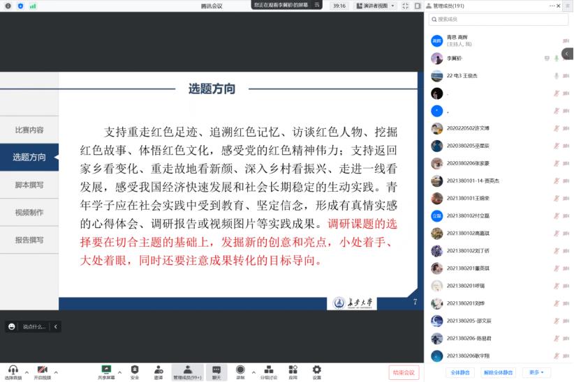 为明晰寒假社会实践活动的具体实施方法以及“挑战杯”红色专项的具体要求,提高同学们参与社会实践活动的积极性和主动性,qy千亿球友会团委于1月16日晚采取线上形式召开了寒假社会实践动员会暨“挑战杯”红色专项培训会,会议由青年思想教育中心高辉主持,学院团委书记金振广、本科生团支部书记和实践队员参加会议。