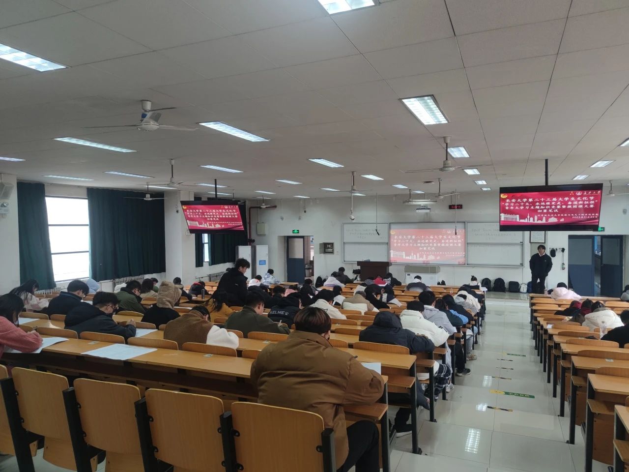 本次竞赛由线下理论笔试答题和微团课讲授两个部分组成,全校共有100名同学参与竞赛。在理论答题环节,围绕党的二十大报告、“青年大学习”网上主题团课内容、习近平新时代中国特色社会主义思想、基础团务知识、《论党的青年工作》等报告、文件、书籍中关于教育、科技、人才、文化等方面的要求和论述展开考察。比赛过程中组织有序、考风端正,同学们积极思考、认真作答,最终13名同学脱颖而出晋级决赛。