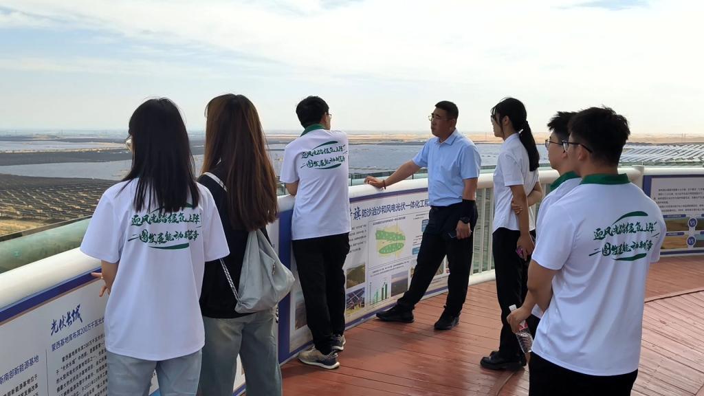 “达拉特光伏发电应用领跑基地总建设规模100万千瓦,引进了国家电投、中广核、华能、三峡/阳光电源、正泰等行业领军企业投资建设,目前已全部建成投产年发‘绿电’可达20亿度,年节约标煤68万吨,年减排二氧化碳约165万吨,输出的电主要保障京津冀地区,基地采用‘光伏+生态治理+有机农林+沙漠旅游’模式推动多产业融合发展。”达拉特旗能源局讲解员向实践队介绍了达拉特光伏基地的基本情况。