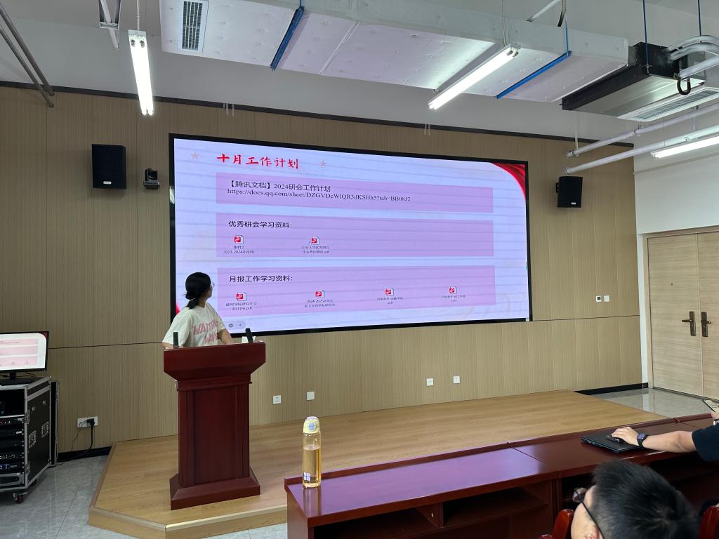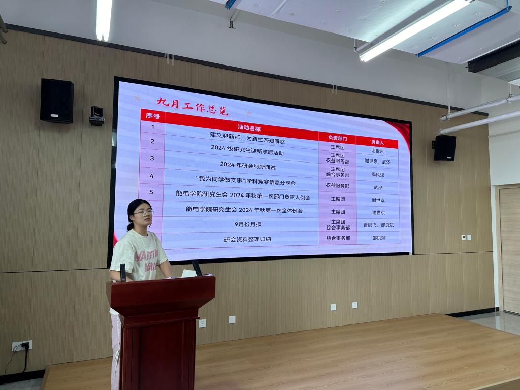 例会伊始谢世京对9月份的工作进行总结。她对研究生会各部门在过去一个月中的辛勤付出表示了肯定,同时指出了在活动宣传、月报编写等方面存在的问题,要求各部门负责人落实解决。随后对10月份的工作计划进行了详细安排。