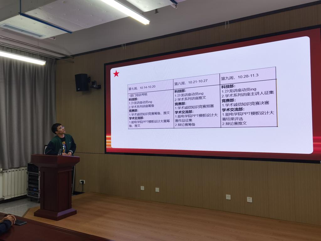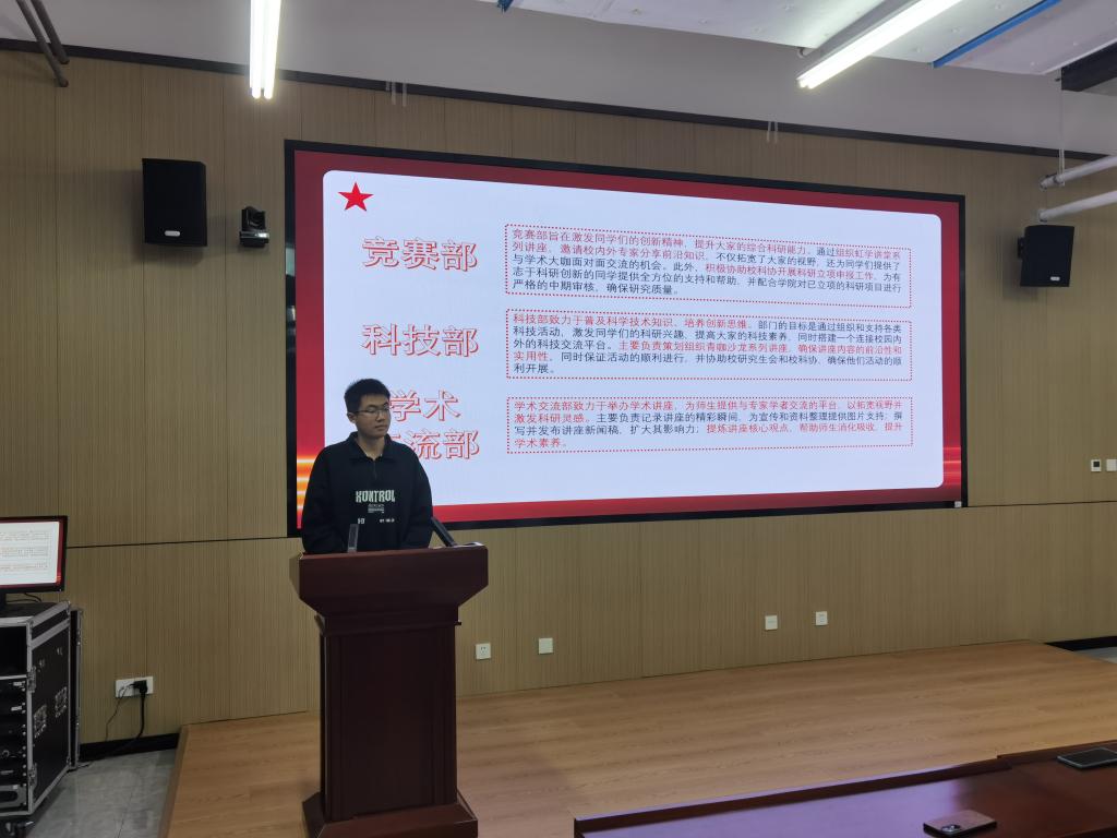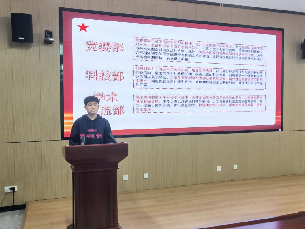 首先,叶培表达了对研会新成员的欢迎,并介绍了各部门主要负责的工作内容和近期的工作安排。他提出各个部门不仅要认真完成自己的本职工作,更要做好部门间的协同配合,保质保量完成学院的各项工作。