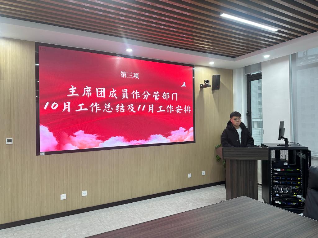 会议伊始谢世京首先对10月份的工作进行了全面的回顾与总结。她高度评价了研会全体成员在过去一个月中的卓越表现,指出各部门之间紧密协作,共同努力,在全校研会月报评比中荣获了第三名的好成绩,这一成就充分展现了团队的凝聚力和执行力。随后,谢世京对11月的工作计划进行了详尽的安排,为接下来的工作指明了方向。