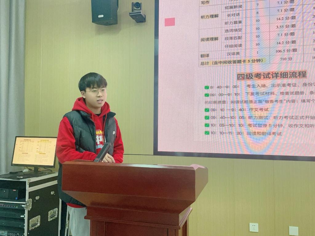 四六级考试是许多大学生都要面临的重要关卡,为了帮助同学们更好地应对下周即将到来的四六级考试,qy千亿球友会学生会邀请两位四六级成绩优异的学长肖睿和詹栩轩,于12月5日晚8点在扶轮大厦612会议室为同学们带来了一场干货满满的四六级经验分享会。