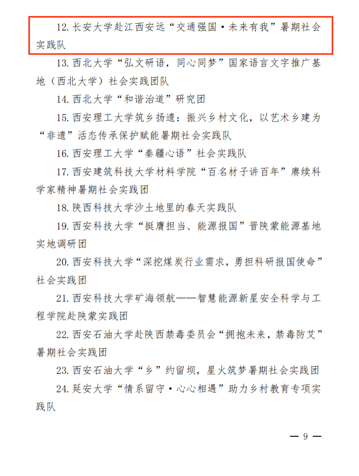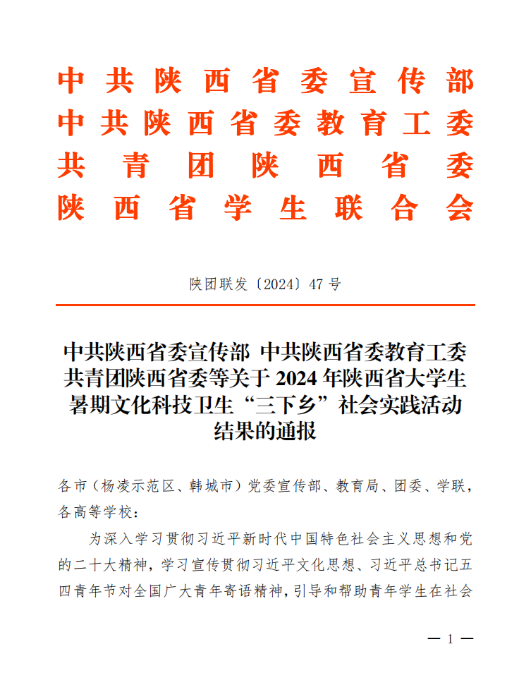 近日,中共陕西省委宣传部、中共陕西省委教育工委、共青团陕西省委等相关部门联合发布了《关于2024年陕西省大学生暑期文化科技卫生“三下乡”社会实践活动结果的通报》,我院赴江西安远“交通强国·未来有我”暑期社会实践队荣获省级优秀团队称号。