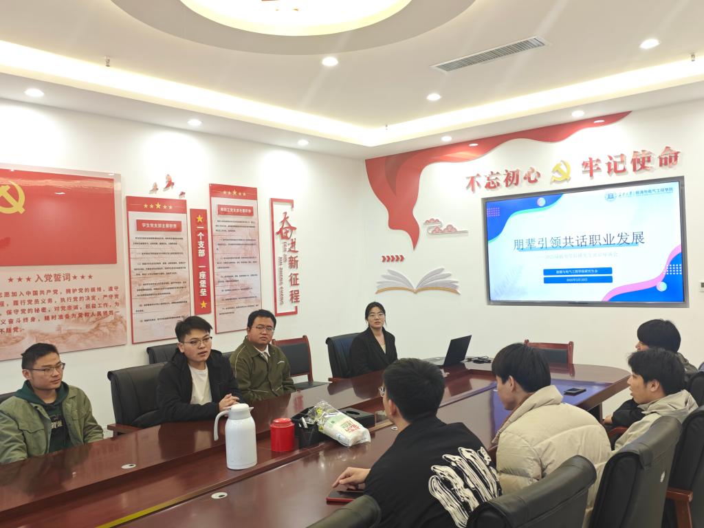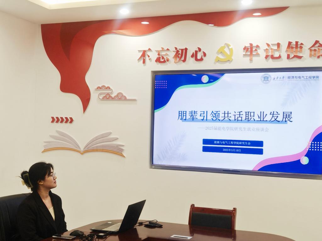 座谈会伊始,谢世京结合近年学院研究生就业数据,从行业趋势、岗位需求、政策变化三方面展开分析。她提到:“能源电力领域技术迭代加速,企业更关注复合型技能人才,建议同学们在科研中注重‘技术+管理’双能力培养,积极参与校企联合项目以增强实践履历。”针对求职流程,她详细讲解了简历投递时间节点、线上面试注意事项及三方协议签订要点,并提醒学生关注学校和学院发布的就业信息,及时获取权威招聘信息。