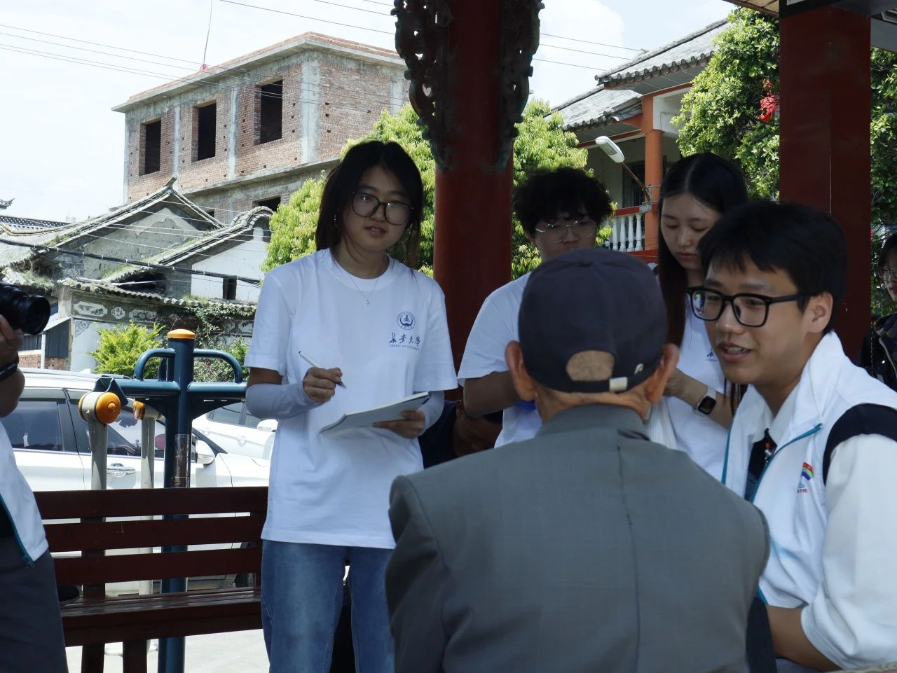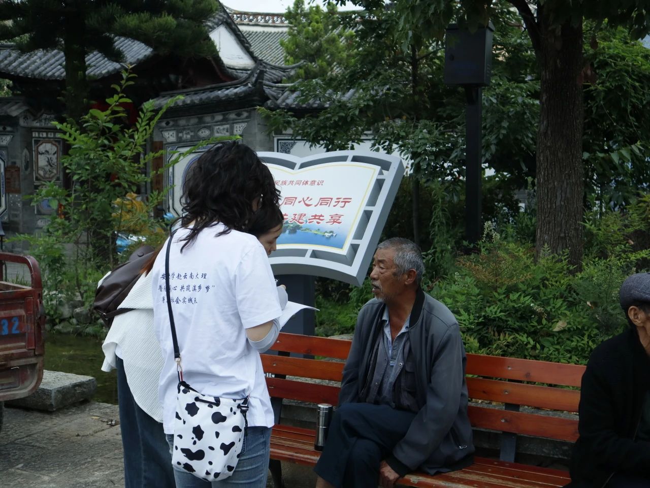 团队成员首先走访古生村,重点访谈了当地村民,发现他们交流时普通话与日常用语混用较多,大爷还热情地向队员们教授了“祝你身体健康”“你好”等白族语言。通过交流了解到,村民家庭内部和邻里之间交流仍以白族语言为主,但年轻一代普遍具备基础普通话能力。
