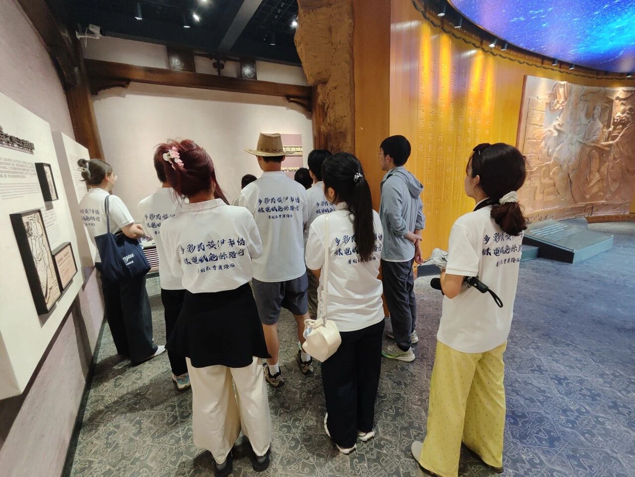 步入庄重肃穆的纪念馆,实践队员的目光被细君公主和解忧公主这两位杰出女性的生平事迹深深吸引。在讲解员声情并茂的讲述中,队员们仿佛穿越千年时光,亲历了公主们远赴西域的漫漫征程。馆内精心陈列的文物、详实的历史文献以及生动的场景复原,无声诉说着公主们作为和平使者,在传播中原先进农耕技术、繁荣丝路商贸、促进汉乌文化交流融合方面立下的不朽功勋。当队员们驻足于展柜前,凝视着那些承载着文明印记的古老农具、书简与器物,深刻体会到“和亲”对边疆安宁与民族和睦的深远贡献。