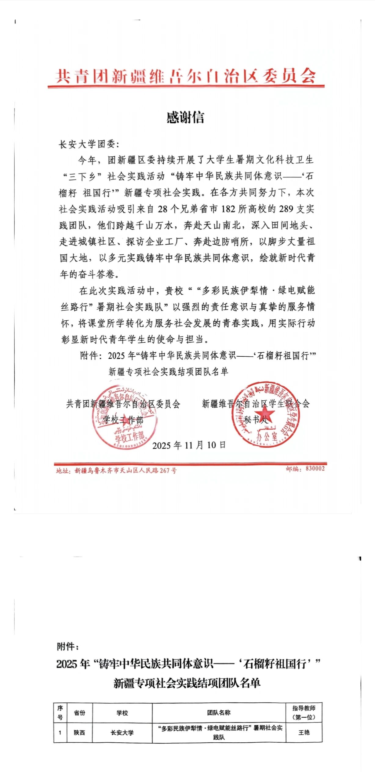 近日,共青团新疆维吾尔自治区委员会向我院实践队发来感谢信,对我院“多彩民族伊犁情·绿电赋能丝路行”社会实践队在2025年大学生暑期文化科技卫生“三下乡”社会实践活动“铸牢中华民族共同体意识—‘石榴籽 祖国行’”新疆专项社会实践中作出的积极贡献予以表扬和感谢!