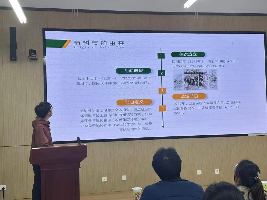 会议伊始,贺博晨同学介绍了植树节的发展历程,从世界首个植树节的诞生,到中国植树节的发展脉络,明晰了植树造林的生态与纪念意义。