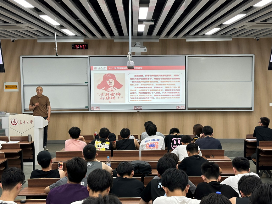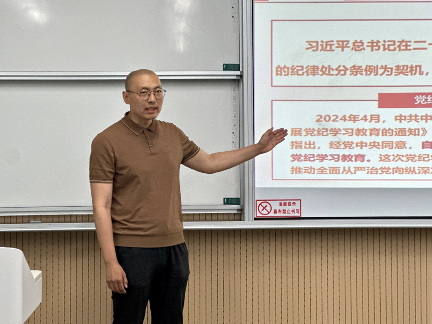 专题党课以《青春之我、青廉之行》的短视频引入,李文从“提高站位,深化认识;聚焦重点,入脑入心”、“以案为鉴,筑牢防线;以案明纪,警钟长鸣”、“青衿之志,履践致远;逐梦启航,挺膺担当”三部分展开授课,首先围绕“六大纪律”带领大家学习了新修订的《中国共产党纪律处分条例》,接着以八个反面具体案例教育毕业生党员们要时刻知敬畏、存戒惧、守底线,最后向大家提出了“发挥榜样作用,践行文明离校”、“及时调整心态,做好身份转变”、“不断磨炼意志,锤炼过硬本领”、“胸怀国之大者,贡献青春力量”的寄语和嘱托。