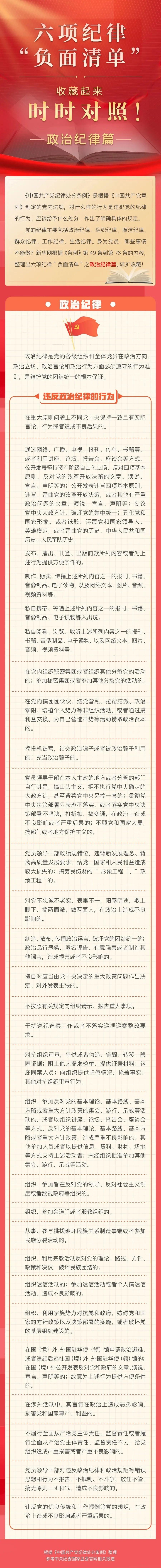 当前,全党正在开展党纪学习教育。这次党纪学习教育明确要聚焦解决一些党员、干部对党规党纪不上心、不了解、不掌握等问题,组织党员特别是党员领导干部认真学习《中国共产党纪律处分条例》,做到学纪、知纪、明纪、守纪,搞清楚党的纪律规矩是什么,弄明白能干什么、不能干什么,把遵规守纪刻印在心,内化为言行准则,进一步强化纪律意识、加强自我约束、提高免疫能力,增强政治定力、纪律定力、道德定力、抵腐定力,始终做到忠诚干净担当。我们根据《条例》内容,整理出六项纪律“负面清单”。今天推出“负面清单”之政治纪律篇,一起收藏学习。